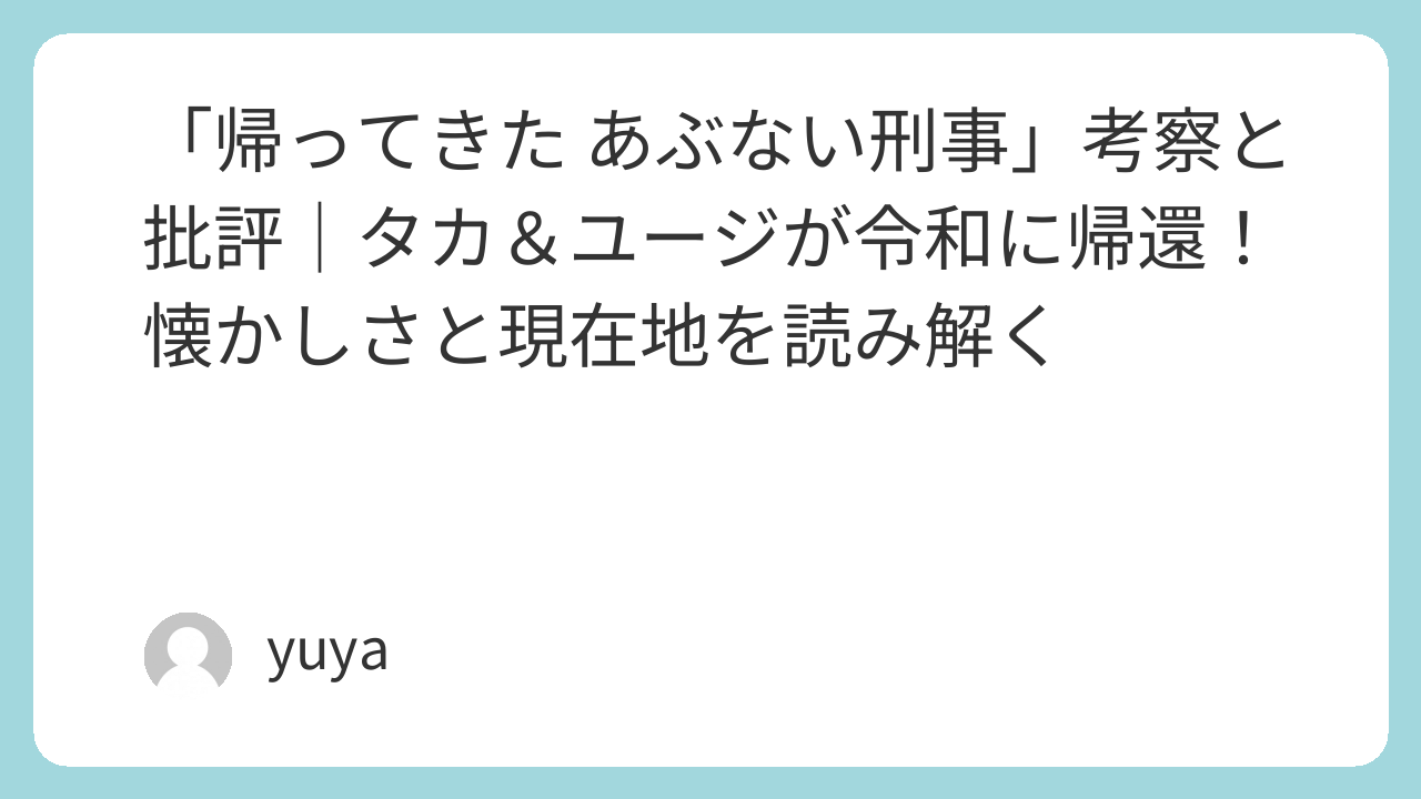 『帰ってきた あぶない刑事』は、タカ&ユージという永遠のヒーローに対する敬意と、時代を越えたノスタルジーを巧みに織り交ぜた作品です。ファンにとっては感動的な“帰還”であり、映画としての完成度には賛否あるものの、その存在自体が日本映画史における貴重なエピソードといえるでしょう。