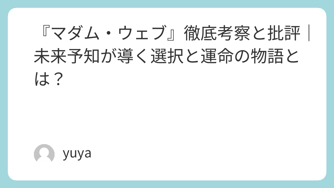 『マダム・ウェブ』は、未来予知というSF的設定を通して、「選択の重さ」「運命との向き合い方」「連帯の力」を描いた意欲作です。派手さには欠けるものの、静かな深みと余韻のある作品として、今後再評価される可能性を秘めています。