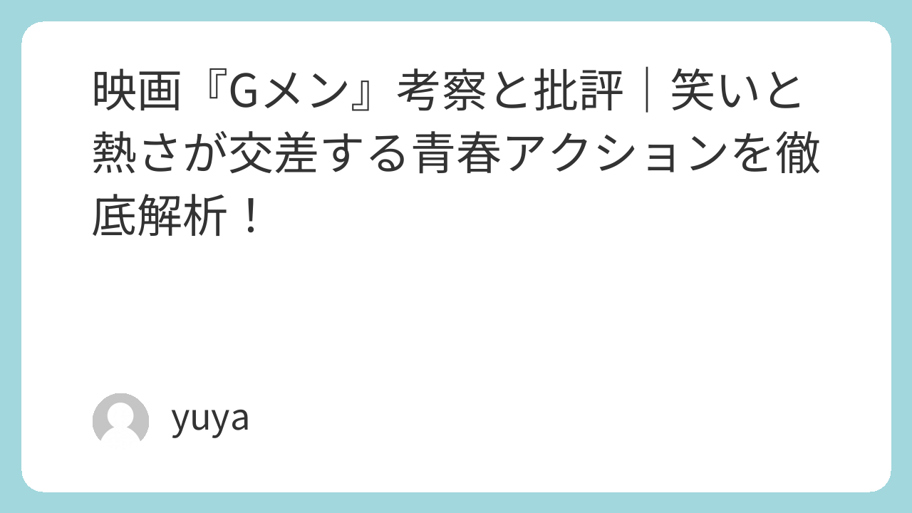 『Gメン』は、王道の青春×友情×アクションに加え、現代的なテンポと笑いを融合させた意欲作です。キャストの魅力、テンポ感の良い演出、ギャグと感動の両立が成されており、多くの観客に支持されています。一方で、ストーリーの深みやリアリティに欠ける部分は今後の課題とも言えるでしょう。