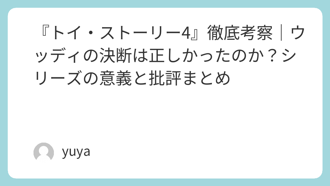 『トイ・ストーリー4』は、“持ち主のために存在するおもちゃ”という従来の価値観を超え、「おもちゃ自身の人生」という新たなテーマを提示した意欲作です。シリーズファンの期待とは異なる方向性に挑戦したことで賛否を呼びましたが、ウッディというキャラクターの成長物語として深い意義を持つ一作です。批評と考察を通して見えてくるのは、「成長と自由、そして自立」という普遍的なテーマに対するピクサーの真摯な問いかけなのです。
