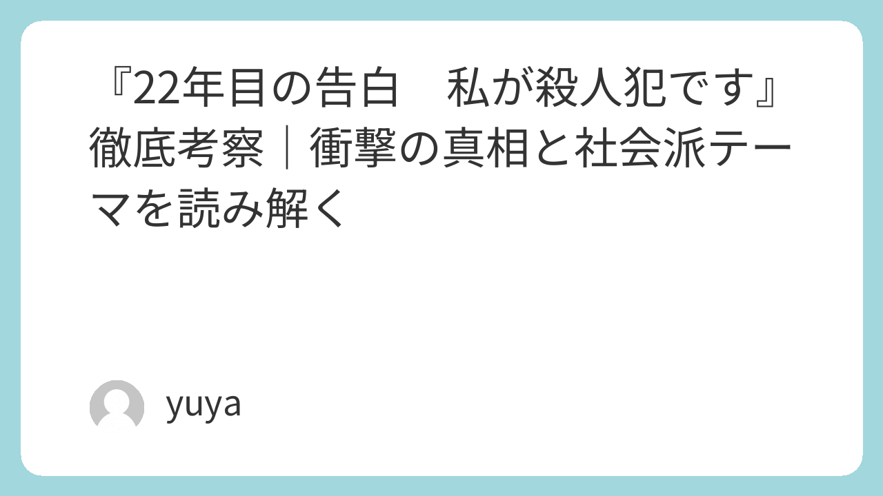 『22年目の告白 私が殺人犯です』は、ミステリーとしての完成度はもちろん、俳優陣の高い演技力、社会的テーマの深さが融合した優れた作品です。観るたびに新たな発見があり、伏線の巧妙さに唸らされる構成は、サスペンス好きにとって必見です。