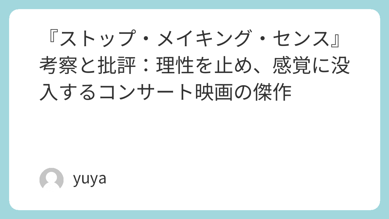 『ストップ・メイキング・センス』は、ライブ映画の枠を越えた“体験型アート”であり、音楽、映像、思想のすべてが高度に融合した作品です。その意図的な不条理さ、非言語的な演出、観客との新たな関係性は、今なお新鮮で刺激的です。