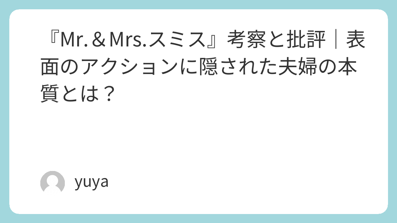 2005年公開の映画『Mr.&Mrs.スミス』は、ブラッド・ピットとアンジェリーナ・ジョリーという当時のスター二人の共演で大きな話題を呼びました。一見、スタイリッシュなアクションコメディとして捉えられがちな本作ですが、その奥には「夫婦」「信頼」「自己開示」といった深いテーマが流れています。
