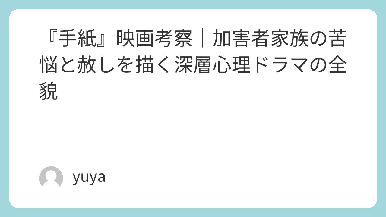 映画『手紙』は、「加害者家族」という難しいテーマに正面から取り組み、視聴者に強烈な問題提起を投げかける作品です。手紙という象徴的モチーフを通じて、家族、罪、赦し、社会のまなざしを多角的に描写し、単なる感動作にとどまらず“考えさせられる映画”としての深みを持っています。批評的に見ても、賛否の余地があり、だからこそ何度も語られる価値のある作品といえるでしょう。
