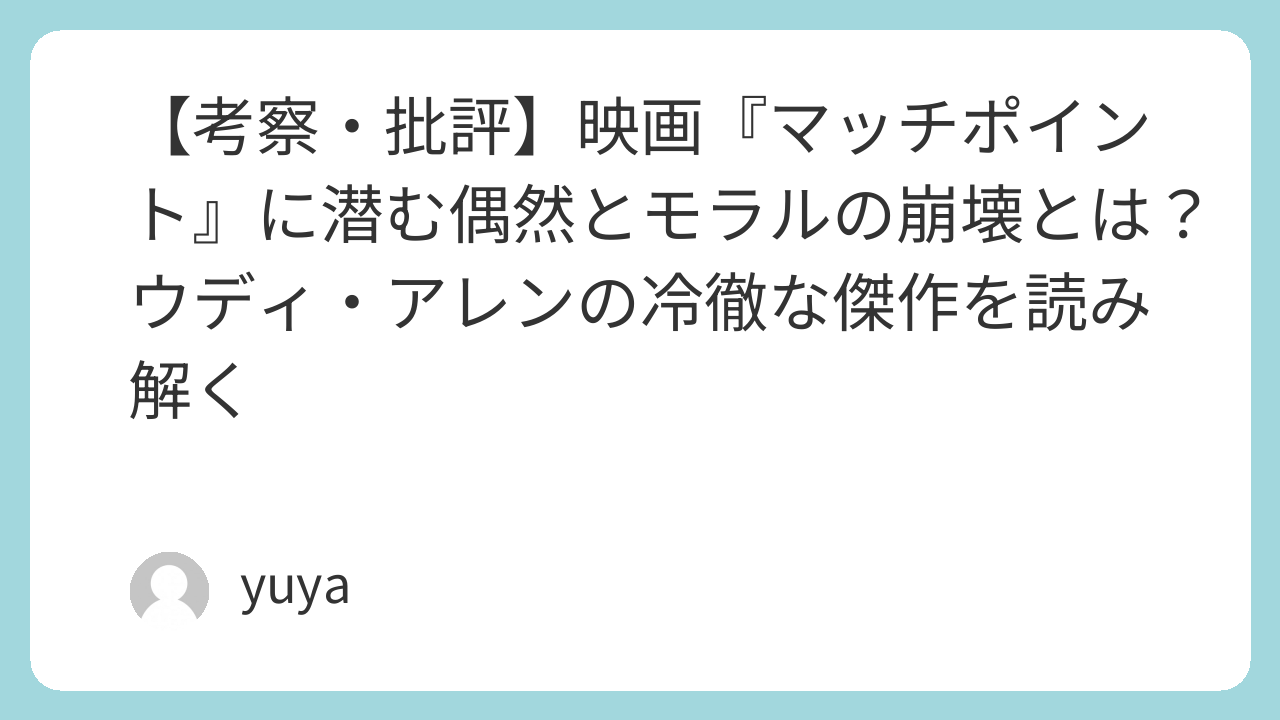 ウディ・アレン監督による2005年の映画『マッチポイント』は、彼のキャリアの中でも異彩を放つ一本です。舞台をロンドンに移し、恋愛、野心、犯罪、そして“偶然”をめぐる哲学的テーマを冷徹に描き切ったこの作品は、観客に強烈な印象と不快な余韻を残します。今回は、本作の構造やテーマ、キャラクター造形、象徴表現などを多角的に読み解いていきます。