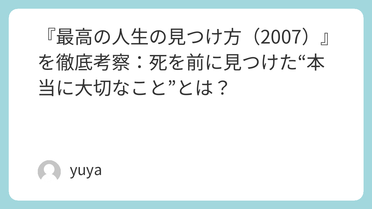 『最高の人生の見つけ方』は、派手な演出や奇抜な展開があるわけではありませんが、誰の心にも問いを残す静かな力を持った作品です。死を知ることで初めて見える人生の輪郭。その輪郭をどう描くかは、観る者一人ひとりに委ねられています。