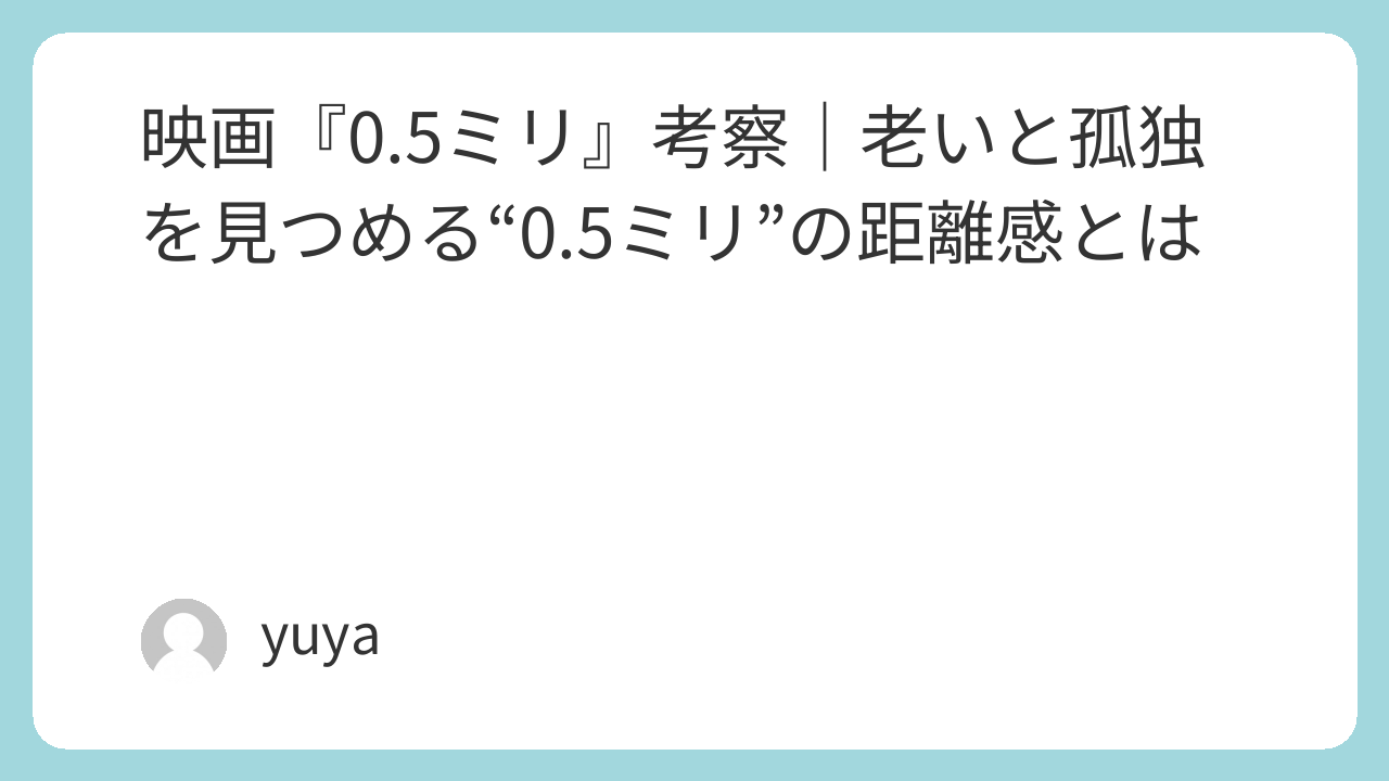 『0.5ミリ』は、老いや孤独、死という重いテーマを扱いながらも、それを押しつけがましくなく、むしろ柔らかな光で包み込むように描き出す作品です。サワの自由で型破りな行動は、「誰かの人生にそっと触れる勇気」を私たちに思い出させてくれます。タイトルに込められた「0.5ミリ」の距離は、ほんの少しの思いやり、ほんの少しの勇気によって、人と人がつながることができるという可能性の象徴なのです。