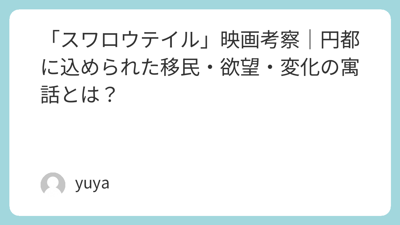 『スワロウテイル』は、その詩的な映像表現と、現代にも通じる深い社会的テーマを持った作品です。移民、経済格差、アイデンティティ、そして居場所とは何か──そうした問いを、観る者それぞれの視点で問い直させる力を持っています。