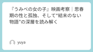 『うみべの女の子』映画考察|思春期の性と孤独、そして“結末のない物語”の深層を読み解く 『うみべの女の子』は、浅野いにお原作の同名漫画を映画化した作品です。性や孤独、思春期の葛藤を赤裸々に描いたこの作品は、観る者に強烈な印象を残します。本記事では、登場人物の心理描写、物語の象徴性、映像演出、そして原作との比較を通して、作品の深... 2025.11.02 Uncategorized