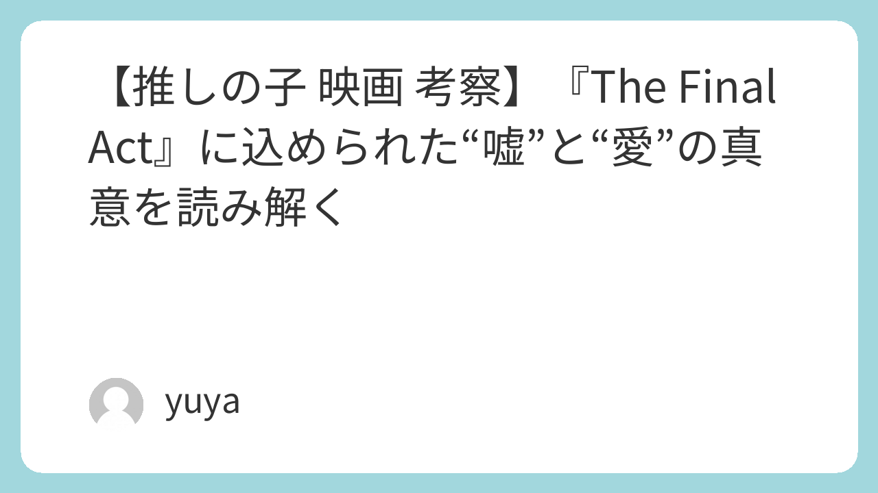 『推しの子 The Final Act』は、芸能界を舞台にしながらも、現代社会に生きる私たち全員に通じる「嘘と本音」「愛と虚像」という普遍的テーマを提示する作品です。映画としての表現力、原作との差異による新しい視点、キャラクターの多面性が、観る者に深い考察の余地を与えてくれます。原作ファンも未視聴者も、この作品を通じて「推し」とは何かを見つめ直すきっかけとなるでしょう。