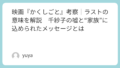 その意味で『アス』は、格差社会や分断の恐怖をホラーの形で可視化した作品だと言えます。地上の快適な暮らしは、地下の苦しみと無関係ではない。恵まれた側と恵まれない側は、完全に切り離された存在ではなく、実は一本の見えない糸で結ばれている。だから本作は「可哀想な地下の人々」の話ではなく、“私たちの幸福は誰の犠牲の上に成り立っているのか”という問いを観客へ投げ返してくるのです。