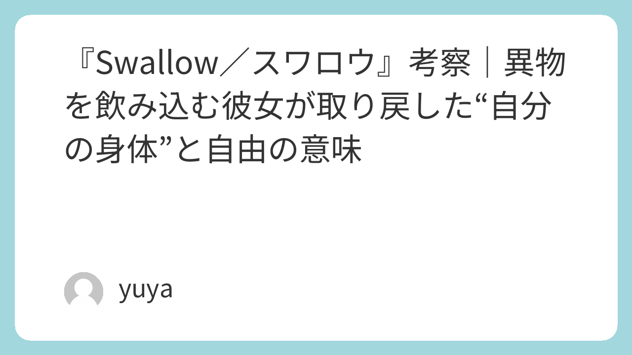 この記事では、映画『Swallow/スワロウ』のあらすじを整理しながら、異食症の意味、結婚生活に潜む支配構造、美しい映像に隠された恐怖、そしてラストシーンが示す“自由”の意味まで詳しく考察していきます。