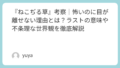 ラストの重要なポイントは、間宮という個人が排除されたあとも、不穏な気配が終わっていないことです。これは、すべての元凶が間宮一人にあったわけではないことを示しているように見えます。彼は確かに触媒ではありましたが、暴力の種そのものは、すでに他者の内側にも存在していた。だから間宮がいなくなっても、“作用”だけは残ってしまうのです。