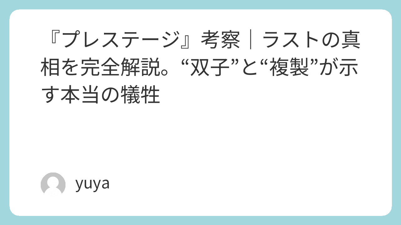 観客は「どうやった?」を追ううちに、すでに提示されているもの(プレッジ)を見落とし、転換(ターン)に目を奪われ、最後の提示(プレステージ)で「そういうことだったのか」と理解させられます。だから本作は、トリックの種よりも“観客の視線操作”が主役になっているんです。