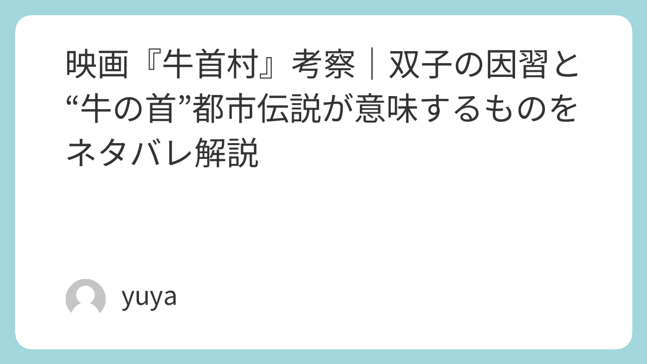 本作のタイトルは、単に“牛の首をした怪物が出る村”という意味ではありません。もとになっているのは、「聞いた者は死ぬほど怖いが、肝心の内容を知る者が誰もいない」とされる怪談“牛の首”です。つまり本当に恐ろしいのは、怪異の姿そのものではなく、中身がわからないまま噂だけが増幅していくことにあります。映画はこの都市伝説に、坪野鉱泉、牛首トンネル、因習村、双子の儀式といった複数の恐怖要素を重ね、「語れない恐怖」を「継承される恐怖」へと作り変えました。タイトルの“牛首”は、都市伝説の記号であると同時に、村の歴史そのものが怪談化した証拠だといえます。