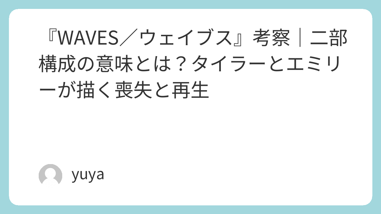 そして本作が最終的に伝えるのは、完璧さではなく、理解しようとする意志の大切さでしょう。音楽、色彩、カメラ、画面比率まで総動員して感情を可視化しながら、最後に映画がたどり着くのはとてもシンプルな地点です。人は壊れる。けれど、人は他者とのつながりのなかで、もう一度立ち上がることもできる。『WAVES』はその痛みと希望を、まさに“波”のようなうねりで体感させる傑作だと言えます。