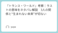 だからこそ本作における救済は、誰かを選別して助けることではなく、「あなたは透明ではない」と言い切る行為として描かれます。生存戦略とは、見えないまま消費される側に回らないための叫びでもある。こどもブロイラーという強烈な言葉は、そんな本作の怒りと祈りを最もむき出しにした象徴だと思います。