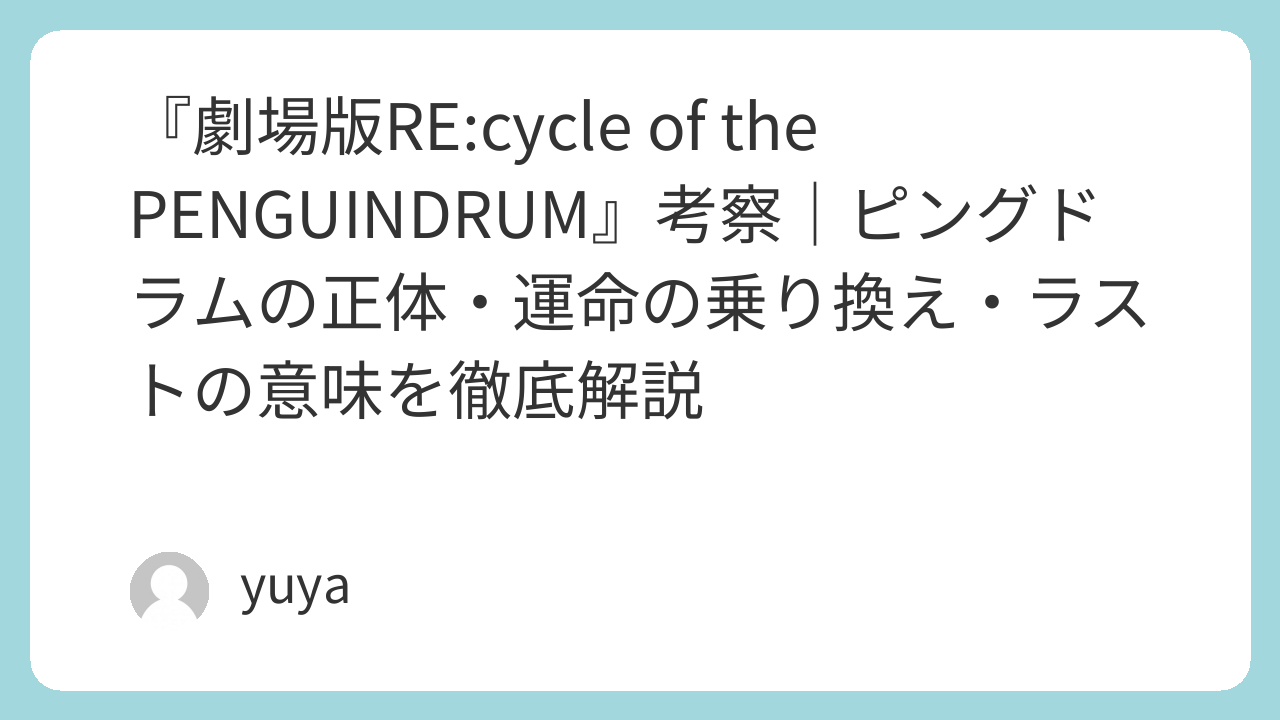 『劇場版RE:cycle of the PENGUINDRUM』のラストは、単純なハッピーエンドでもバッドエンドでもありません。むしろ本作は最後に、喪失を消さずに、それでも未来へ進むしかないという厳しくも優しい地点へ着地します。誰かが誰かのために支払った代償は消えないし、すべてが元通りになるわけでもない。けれど、その犠牲が無意味ではなかったと感じさせるだけの温度が、ラストにはあります。