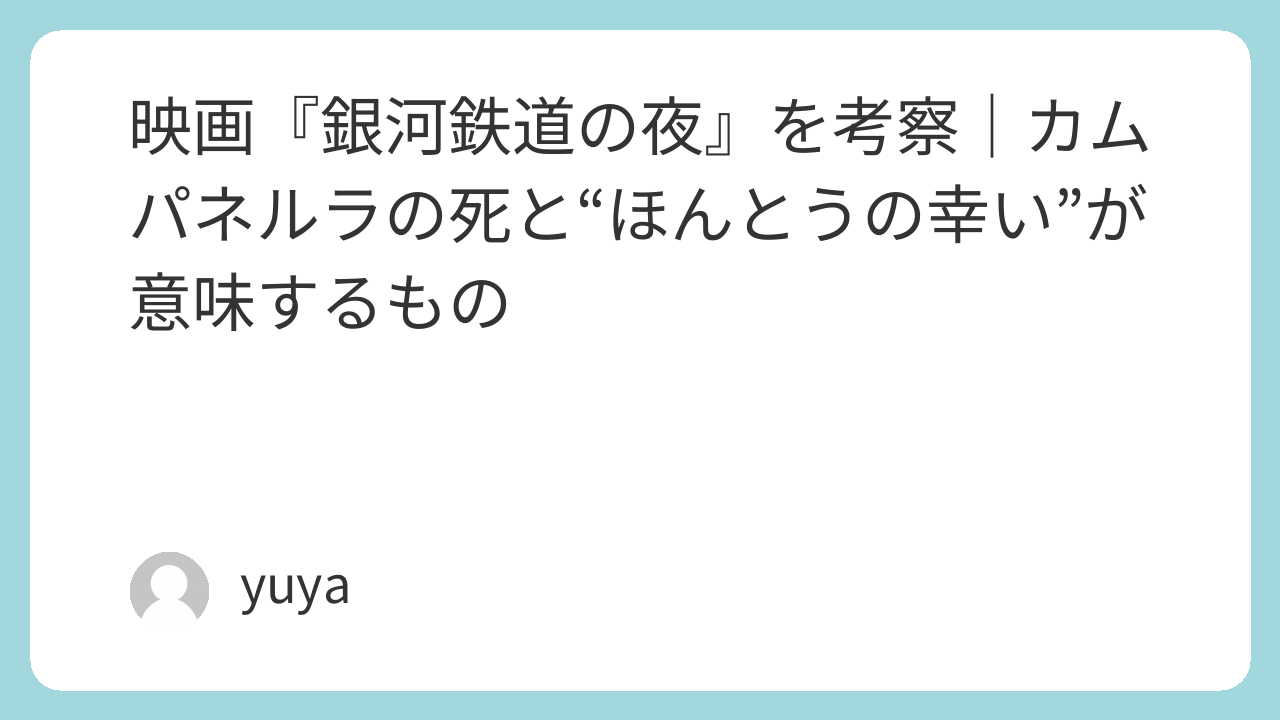 映画『銀河鉄道の夜』は、明快な答えを与えてくれる作品ではありません。むしろ観終えたあとに、「ほんとうの幸いとは何か」「大切な人との別れをどう受け止めるか」「人はだれかのために生きられるのか」といった問いを静かに残していきます。その“答えのなさ”こそが、この作品の価値です。考察したくなるのは、難解だからではなく、観る人自身の生き方が試されるからなのでしょう。