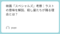 ラストに残されるポラロイド写真は、とても象徴的な小道具です。ネタバレ考察では、この写真に写っているのは“任務の顔”ではなく、束の間でも仲間として笑っていた5人の時間だと読まれています。つまり写真は、彼らが殺し屋だった事実を否定するものではなく、それでも確かに一度は“チーム”だったことを証明する痕跡です。言葉で信頼を回復できないからこそ、写真という無言の記録が効いてくるのだと思います。