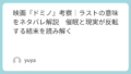 この映画が本当に恐ろしいのは、悪が露骨な暴力や怪物の姿ではなく、名声・成功・自己陶酔として差し出される点です。最後に示されるのは、ケヴィンが法廷での勝利欲からは一歩引いても、今度は「世間に称賛されたい」という別の欲望に引っかかるという皮肉です。ラストは救済ではなく、「人間は自分の弱点を完全には見抜けない」という警句として読むのが自然でしょう。