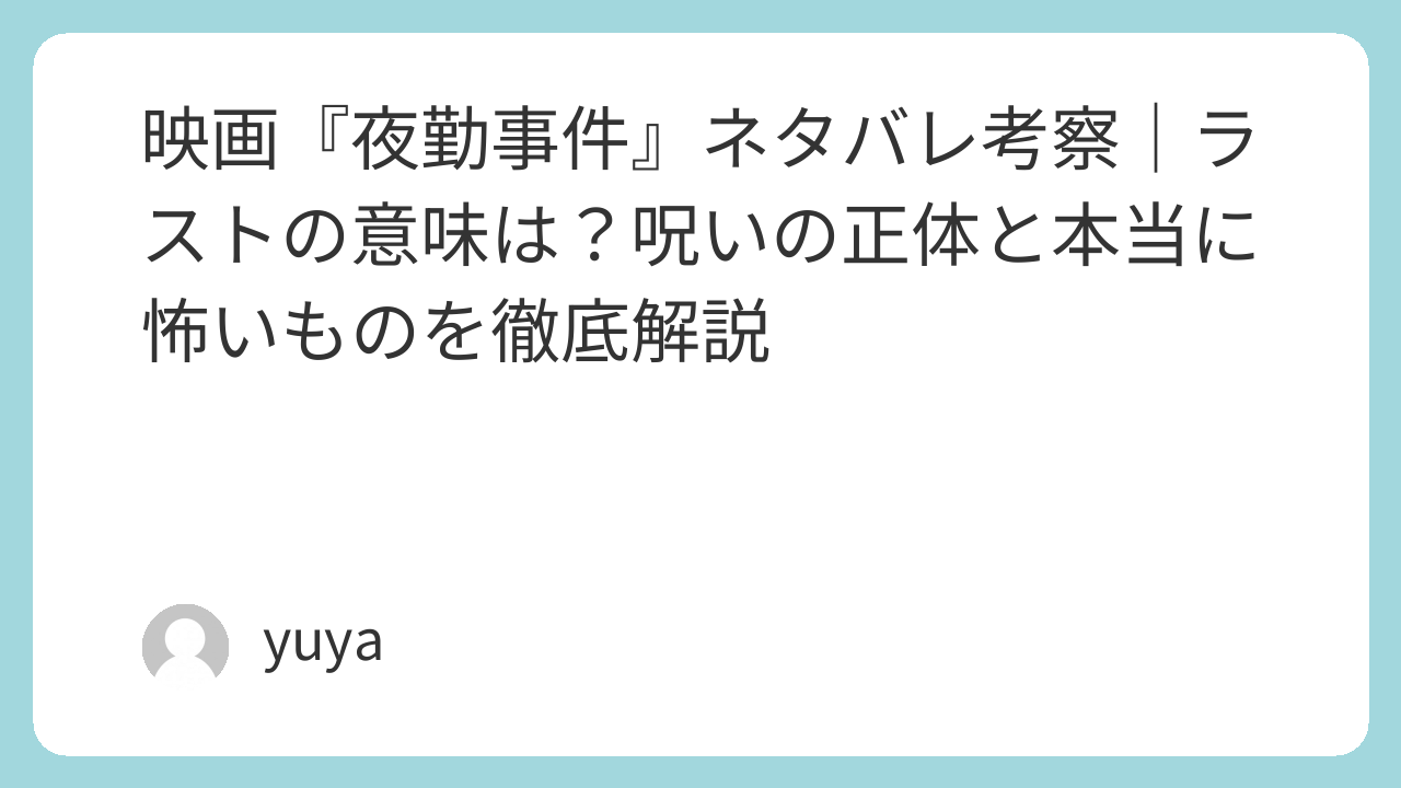 ただし、本作が面白いのは、完全にどちらかへ断定しきらないところです。もしすべてが偽装なら論理的には筋が通る一方で、映像としてはなお説明しきれない不気味さも残されている。だから観客は「呪いなどなかった」と安心できず、逆に「全部本物だった」とも言い切れません。この宙吊りの感覚こそが『夜勤事件』の後味を悪くし、見終わったあとも考察したくなる最大の要因になっています。
