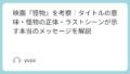 さらに重要なのは、旅の主体が“大人”ではなく子どもであることです。にゃっ太は世界の残酷さを理屈で説明しません。ただ見て、巻き込まれ、先へ進むだけです。だからこそ観客は、社会や文明の異常さを「理論」ではなく「体感」として受け取ることになります。この旅は成長物語というより、世界の裏側を覗いてしまった子どもの通過儀礼であり、その結果として、にゃっ太は元の無垢な場所には戻れなくなったように見えるのです。これは作品全体から導ける解釈ですが、ロードムービー的構造と夢・臨死体験めいた展開を踏まえると、かなり自然な読み方だと思います。