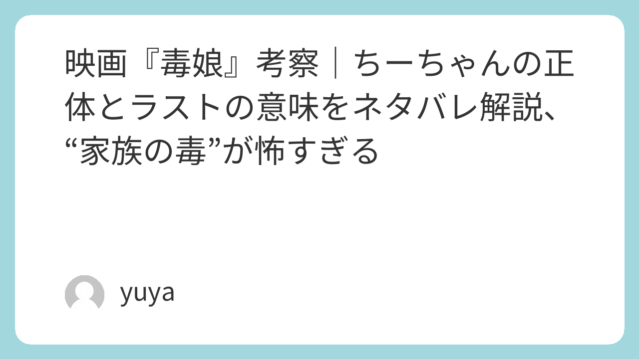 この記事では、映画『毒娘』のあらすじや物語のポイントを整理しながら、ちーちゃんの正体、家族に潜む毒、ラストの意味についてネタバレありでじっくり考察していきます。
