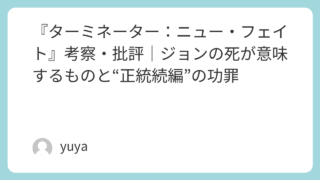 『ターミネーター:ニュー・フェイト』考察・批評|ジョンの死が意味するものと“正統続編”の功罪 映画『ターミネーター:ニュー・フェイト』は、1984年の第1作から続く人気シリーズの“正統な続編”として2019年に公開されました。特にジェームズ・キャメロンが製作に復帰し、『T2』の直接的な続編という位置づけが話題を呼びました。しかし、期... 2025.10.05 Uncategorized