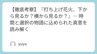 【徹底考察】『打ち上げ花火、下から見るか?横から見るか?』― 時間と選択の物語に込められた真意を読み解く 1993年に岩井俊二監督が手がけたTVドラマ版を原作とし、2017年にアニメ映画として新たにリメイクされた『打ち上げ花火、下から見るか?横から見るか?』。原作の情緒とノスタルジーを受け継ぎつつ、アニメ版では「もしも玉」と呼ばれる不思議なアイ... 2025.10.05 Uncategorized