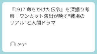 『1917 命をかけた伝令』を深掘り考察|ワンカット演出が映す“戦場のリアル”と人間ドラマ 第一次世界大戦を舞台に、わずか数人の命に託された重大な任務。その伝令任務の24時間を“ワンカット風”で描くという異色の試みに挑んだ映画『1917 命をかけた伝令』。サム・メンデス監督が自らの祖父の体験をヒントに描いた本作は、戦争映画のジャン... 2025.10.05 Uncategorized