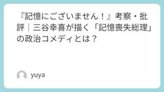 『記憶にございません!』考察・批評|三谷幸喜が描く「記憶喪失総理」の政治コメディとは? 三谷幸喜監督の作品といえば、笑いと皮肉、そして人間味あふれるキャラクターが魅力のコメディ映画が多くのファンに支持されています。2019年に公開された『記憶にございません!』もその一つ。記憶を失った総理大臣が織りなす政治劇というユニークな設定... 2025.10.05 Uncategorized