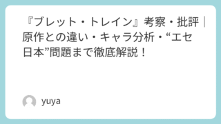 『ブレット・トレイン』考察・批評|原作との違い・キャラ分析・“エセ日本”問題まで徹底解説! 2022年公開の映画『ブレット・トレイン』(原題:Bullet Train)は、伊坂幸太郎の小説『マリアビートル』を原作とし、ブラッド・ピット主演、デヴィッド・リーチ監督によるノンストップ・アクション映画です。本作は日本の新幹線を舞台に、多... 2025.10.05 Uncategorized