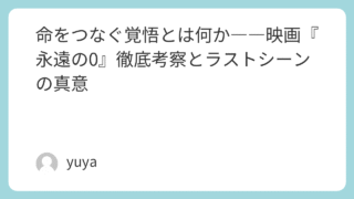 命をつなぐ覚悟とは何か――映画『永遠の0』徹底考察とラストシーンの真意 2013年に公開された映画『永遠の0』は、百田尚樹の同名小説を原作とし、戦争と家族の記憶をテーマに多くの観客の心を打ちました。一見すると「特攻隊員の物語」と捉えられがちですが、本作は単なる戦争映画ではありません。物語に込められた深い思想や人... 2025.10.05 Uncategorized