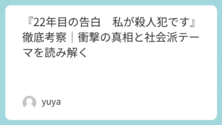 『22年目の告白 私が殺人犯です』徹底考察|衝撃の真相と社会派テーマを読み解く 2017年に公開された映画『22年目の告白 私が殺人犯です』は、日本映画としては珍しく、社会派サスペンスの要素と巧妙なミステリー構成を融合させた作品です。原作は韓国映画『殺人の告白』ですが、日本版ならではのアプローチと演出で、独自の評価を確... 2025.10.05 Uncategorized
