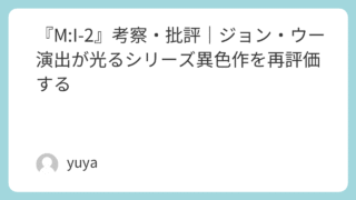 『M:I-2』考察・批評|ジョン・ウー演出が光るシリーズ異色作を再評価する 1996年の第1作『ミッション:インポッシブル』の大ヒットを受けて、2000年に公開されたシリーズ第2作『M:I-2』。前作のスパイ・サスペンス色を大胆に捨て、香港アクション映画の巨匠ジョン・ウー監督がその美学を全面に押し出した作風は、当時... 2025.10.06 Uncategorized