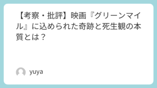 【考察・批評】映画『グリーンマイル』に込められた奇跡と死生観の本質とは? 1999年に公開された映画『グリーンマイル』は、スティーヴン・キングの小説を原作に、フランク・ダラボン監督が映画化したヒューマンドラマです。死刑囚と看守の間に芽生える奇跡的な交流を描いた本作は、感動作として語られる一方で、重層的なテーマと倫... 2025.10.06 Uncategorized