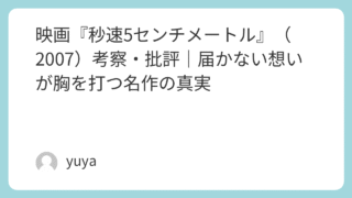 映画『秒速5センチメートル』(2007)考察・批評|届かない想いが胸を打つ名作の真実 新海誠監督の代表作の一つ『秒速5センチメートル』(2007年)は、その美しい映像美と、静かに胸を打つストーリーで多くの人の記憶に残る作品です。しかし本作は、単なる“切ない恋愛アニメ”にとどまりません。時間、距離、感情のすれ違い——誰もが経験... 2025.10.19 Uncategorized