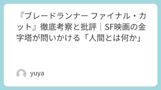 『ブレードランナー ファイナル・カット』徹底考察と批評|SF映画の金字塔が問いかける「人間とは何か」 リドリー・スコット監督による1982年公開の映画『ブレードランナー』は、単なるSF映画の枠を超え、哲学的な問いを内包する作品として評価されています。その中でも2007年に発表された「ファイナル・カット」は、監督自身が編集に完全な権限を持ち、... 2025.10.20 Uncategorized