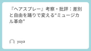 『ヘアスプレー』考察・批評:差別と自由を踊りで変える“ミュージカル革命” 映画『ヘアスプレー』は、明るくポップなミュージカル映画でありながら、アメリカ社会の抱える“差別”という重いテーマを軽やかに描いた作品です。2007年に公開されたこの映画は、1988年の同名映画を原作とし、さらにその舞台ミュージカルを映画化し... 2025.10.20 Uncategorized