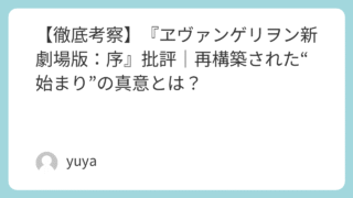 【徹底考察】『ヱヴァンゲリヲン新劇場版:序』批評|再構築された“始まり”の真意とは? 2007年に公開された『ヱヴァンゲリヲン新劇場版:序』(以下「序」)は、1995年のTVアニメ『新世紀エヴァンゲリオン』の再構築(リビルド)としてスタートした全4部作の第1作です。既に世界観やキャラクターに親しんでいるファンはもちろん、初め... 2025.10.20 Uncategorized