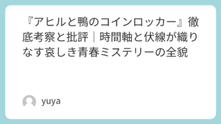 『アヒルと鴨のコインロッカー』徹底考察と批評|時間軸と伏線が織りなす哀しき青春ミステリーの全貌 伊坂幸太郎原作、瑛太と濱田岳が主演を務めた映画『アヒルと鴨のコインロッカー』(2007年)は、巧みに張り巡らされた伏線と、ラストに向けて明かされていく真実が観る者に強烈な余韻を残すミステリー作品です。一見軽快な会話劇やユーモラスな登場人物に... 2025.10.20 Uncategorized