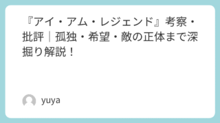 『アイ・アム・レジェンド』考察・批評|孤独・希望・敵の正体まで深掘り解説! 2007年に公開された映画『アイ・アム・レジェンド』は、ウィル・スミス演じるロバート・ネビル博士が、荒廃したニューヨークを舞台にたった一人で生き残る姿を描いたポストアポカリプス作品です。公開当時は大ヒットし、ビジュアルとストーリーテリングで... 2025.10.20 Uncategorized