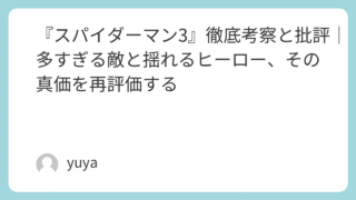 『スパイダーマン3』徹底考察と批評|多すぎる敵と揺れるヒーロー、その真価を再評価する 2007年に公開されたサム・ライミ監督による『スパイダーマン3』は、当時の観客や批評家の間で賛否が大きく分かれた作品です。前2作で高評価を得ていたシリーズが、「キャラクターの詰め込みすぎ」「ストーリーの散漫さ」といった理由で批判された一方で... 2025.10.21 Uncategorized
