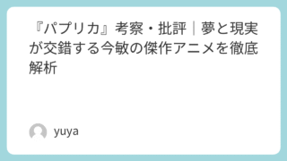 『パプリカ』考察・批評|夢と現実が交錯する今敏の傑作アニメを徹底解析 2006年に公開された今敏監督によるアニメ映画『パプリカ』は、観る者に強烈な印象を残す作品だ。筒井康隆の同名小説を原作とし、「夢」をテーマに描かれたその世界観は、鮮烈な映像美と複雑な物語構造によって、国内外の映画ファンを魅了してきた。本作は... 2025.10.14 Uncategorized