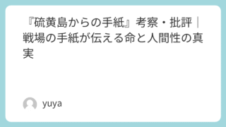 『硫黄島からの手紙』考察・批評|戦場の手紙が伝える命と人間性の真実 第二次世界大戦末期の激戦地、硫黄島を舞台にしたクリント・イーストウッド監督による映画『硫黄島からの手紙』は、ハリウッド作品でありながら日本兵の視点から戦争を描くという異例の作品です。戦争映画でありながら、単なる歴史の再現や勝者・敗者の視点に... 2025.10.14 Uncategorized