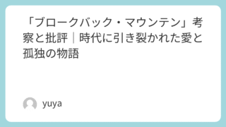 「ブロークバック・マウンテン」考察と批評|時代に引き裂かれた愛と孤独の物語 アメリカ西部の広大な自然を背景に、20年に渡る2人の男性の秘められた愛と葛藤を描いた映画『ブロークバック・マウンテン』。アン・リー監督の静謐な演出と、ヒース・レジャーとジェイク・ジレンホールによる繊細な演技が、多くの観客の胸に深く刺さりまし... 2025.10.15 Uncategorized
