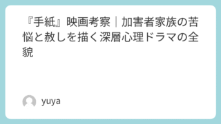 『手紙』映画考察|加害者家族の苦悩と赦しを描く深層心理ドラマの全貌 東野圭吾の同名小説を原作にした映画『手紙』(2006年公開)は、犯罪加害者の家族として生きる青年の苦悩を通じて、社会の差別意識と赦しの意味を深く問いかける作品です。この映画は、派手なアクションやサスペンス性ではなく、登場人物の内面と周囲の人... 2025.10.15 Uncategorized