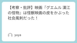 【考察・批評】映画『グエムル 漢江の怪物』は怪獣映画の皮をかぶった社会風刺だった! 韓国映画界を牽引するポン・ジュノ監督が2006年に放った異色の怪獣映画『グエムル 漢江の怪物』は、単なるパニック映画にとどまらず、家族ドラマ、社会風刺、政治批判を織り交ぜた複合的な作品として高い評価を受けている。本記事では、作品を多面的に捉... 2025.10.15 Uncategorized