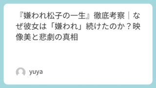 『嫌われ松子の一生』徹底考察|なぜ彼女は「嫌われ」続けたのか?映像美と悲劇の真相 中島哲也監督による映画『嫌われ松子の一生』(2006年)は、山田宗樹による同名小説を原作とし、一人の女性の数奇な人生を、鮮やかかつ重層的に描いた作品です。一見するとカラフルでポップな映像美に彩られたミュージカル風の演出が目を引きますが、その... 2025.10.15 Uncategorized